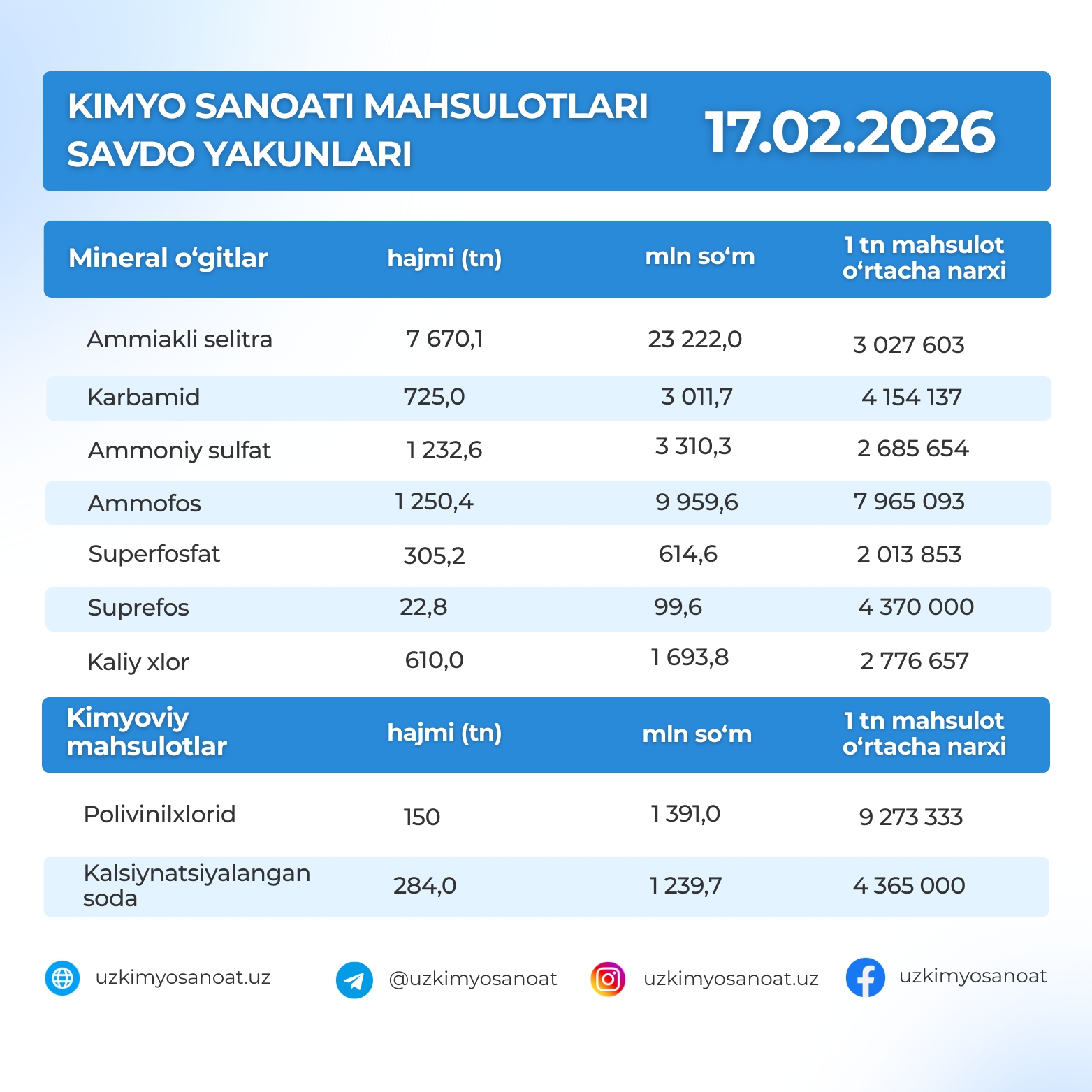 O‘zbekiston Respublika tovar-xom ashyo birjasidagi kimyo sanoati mahsulotlarining savdo yakunlari : 17.02.2026