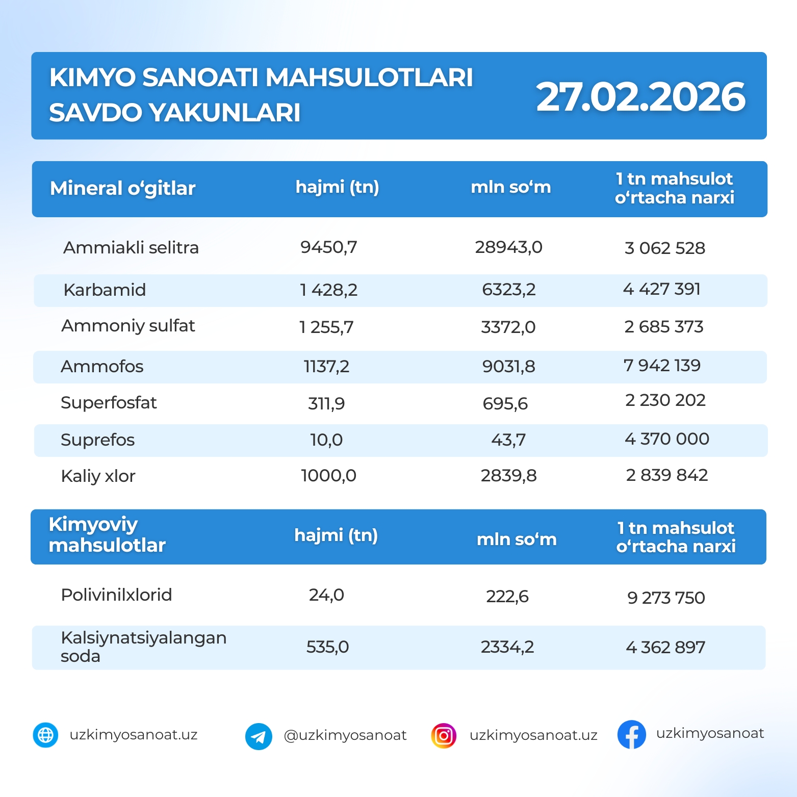 O‘zbekiston Respublika tovar-xom ashyo birjasidagi kimyo sanoati mahsulotlarining savdo yakunlari : 27.02.2026