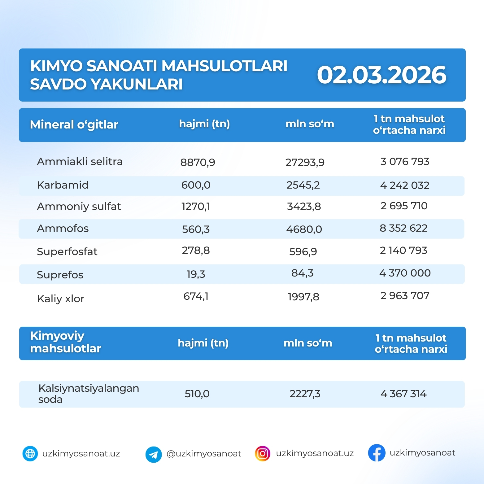 O‘zbekiston Respublika tovar-xom ashyo birjasidagi kimyo sanoati mahsulotlarining savdo yakunlari: 02.03.2026
