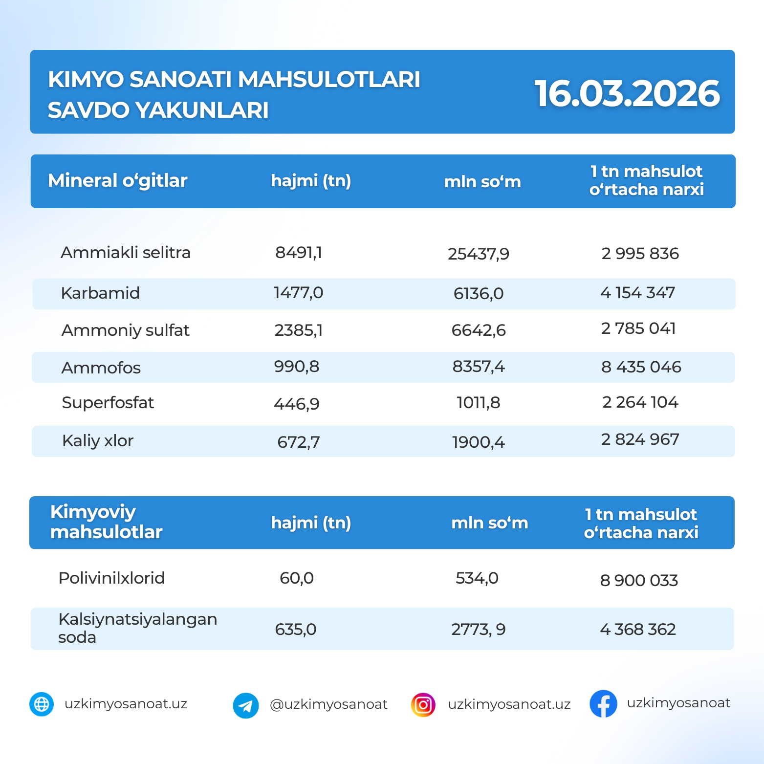 O‘zbekiston Respublika tovar-xom ashyo birjasidagi kimyo sanoati mahsulotlarining savdo yakunlari: 16.03.2026