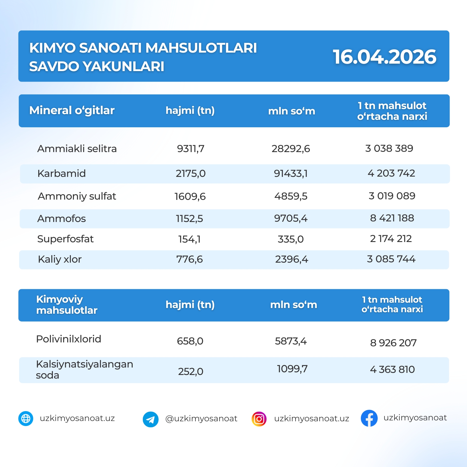 O‘zbekiston Respublika tovar-xom ashyo birjasidagi kimyo sanoati mahsulotlarining savdo yakunlari: 16.04.2026