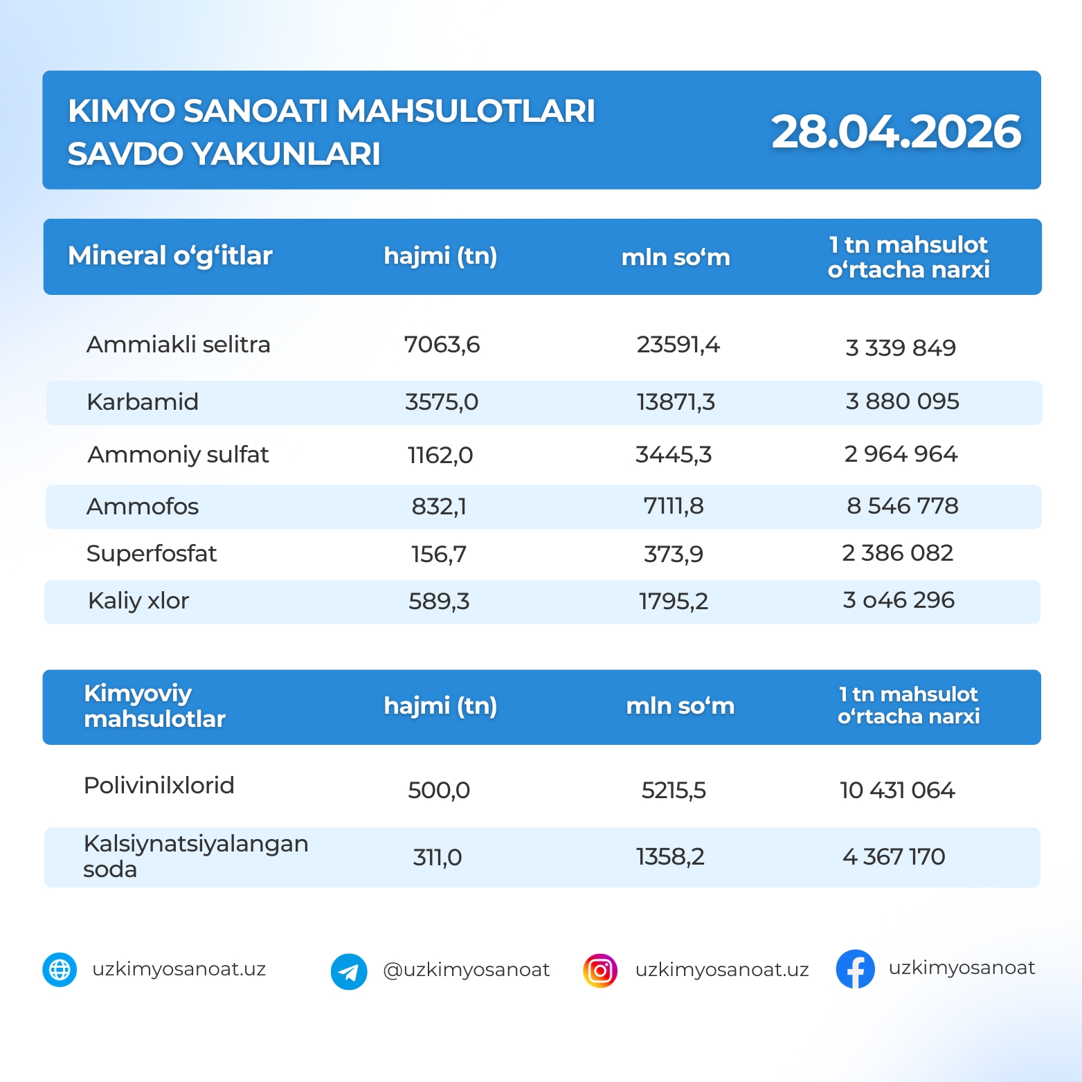 O‘zbekiston Respublika tovar-xom ashyo birjasidagi kimyo sanoati mahsulotlarining savdo yakunlari: 28.04.2026