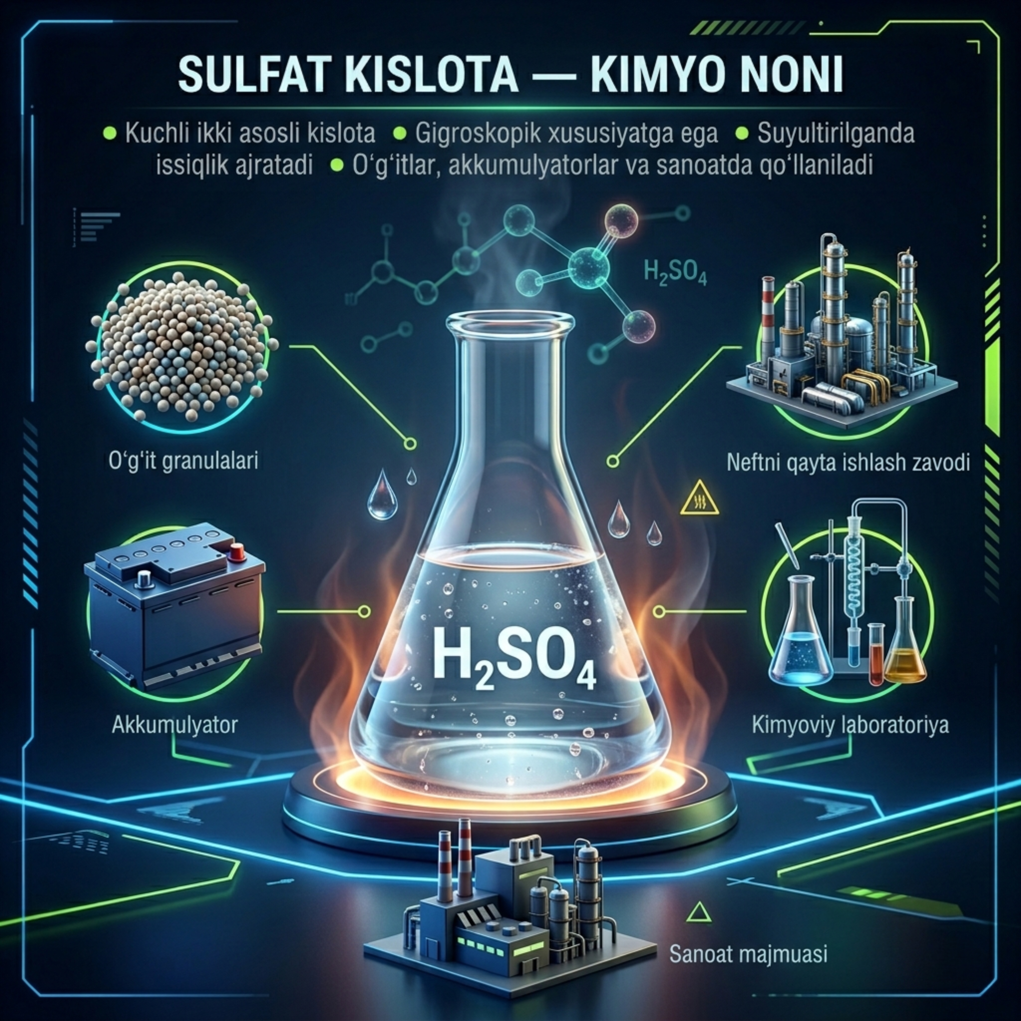 Bilasizmi - sulfat kislotasi - oʻta kuchli, ikki asosli noorganik kislota, rangsiz, hidsiz, moysimon suyuqlik.