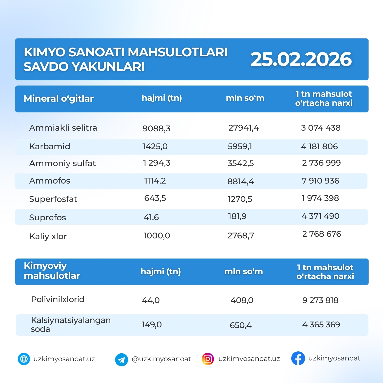 O‘zbekiston Respublika tovar-xom ashyo birjasidagi kimyo sanoati mahsulotlarining savdo yakunlari: 25.02.2026