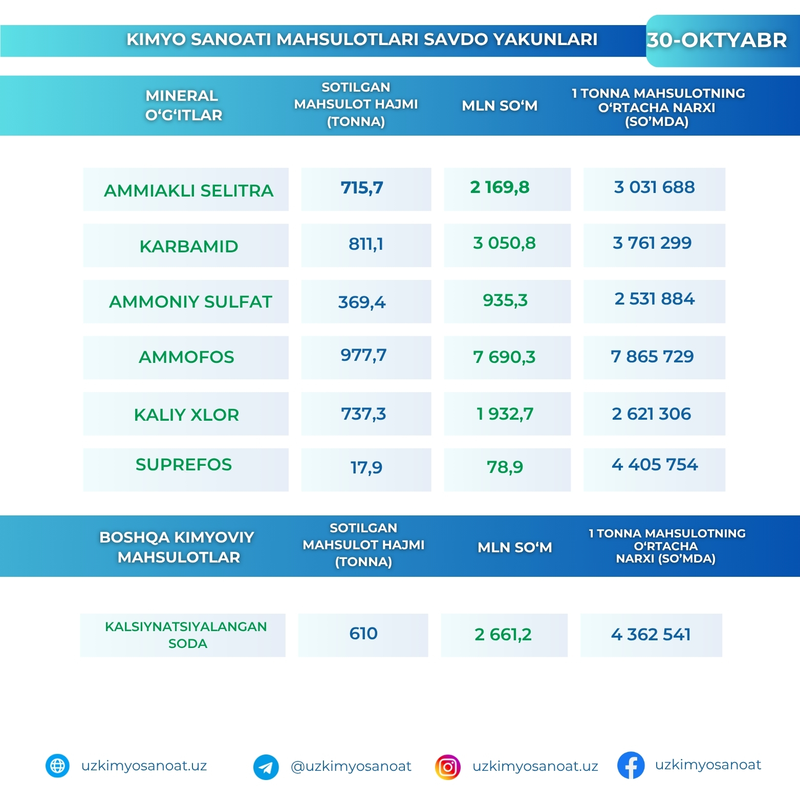 Oʻzbekiston Respublika tovar-xom ashyo birjasidagi kimyo sanoati mahsulotlarining 30-oktyabr kunidagi savdo yakunlari