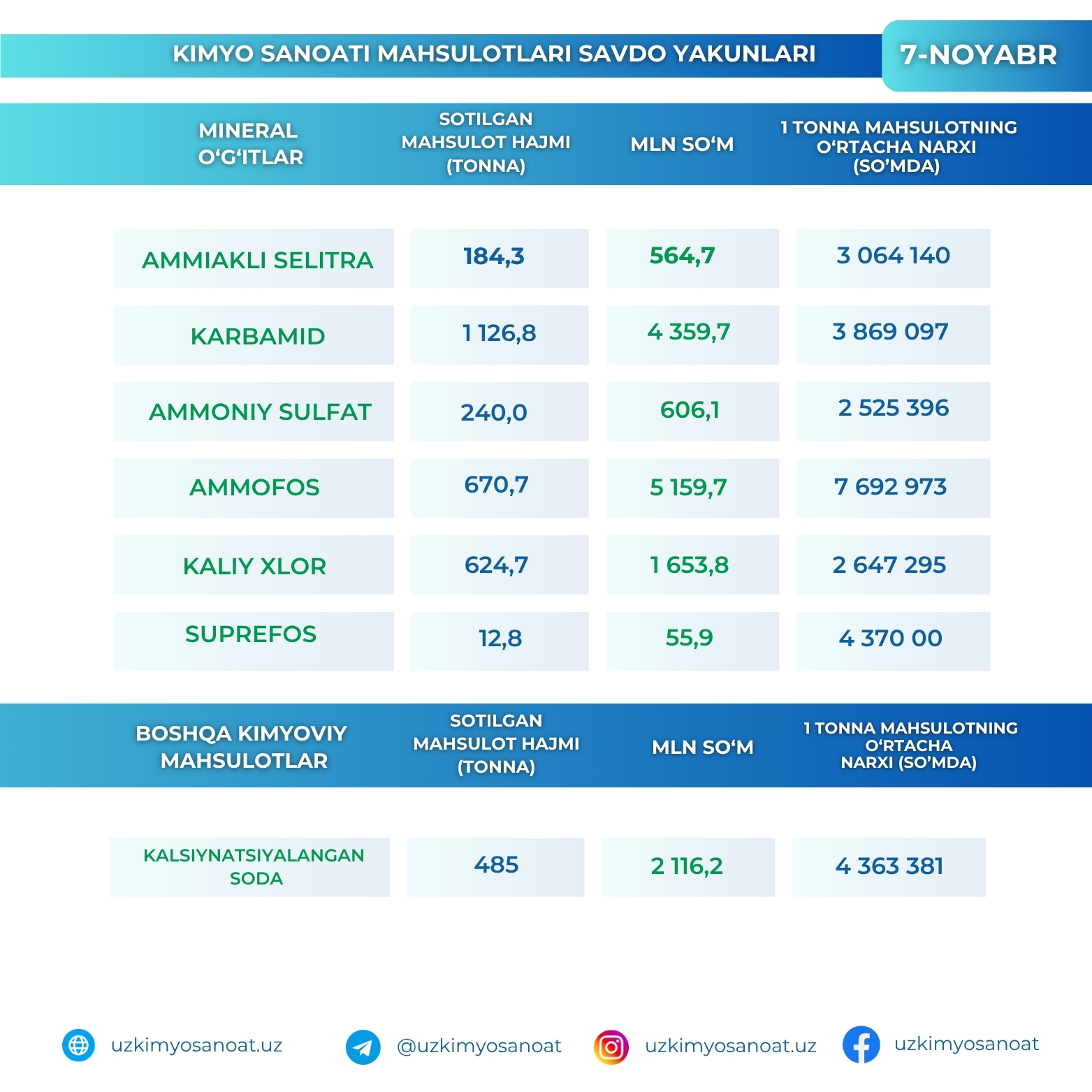 Oʻzbekiston Respublika tovar-xom ashyo birjasidagi kimyo sanoati mahsulotlarining 7-noyabr kunidagi savdo yakunlari