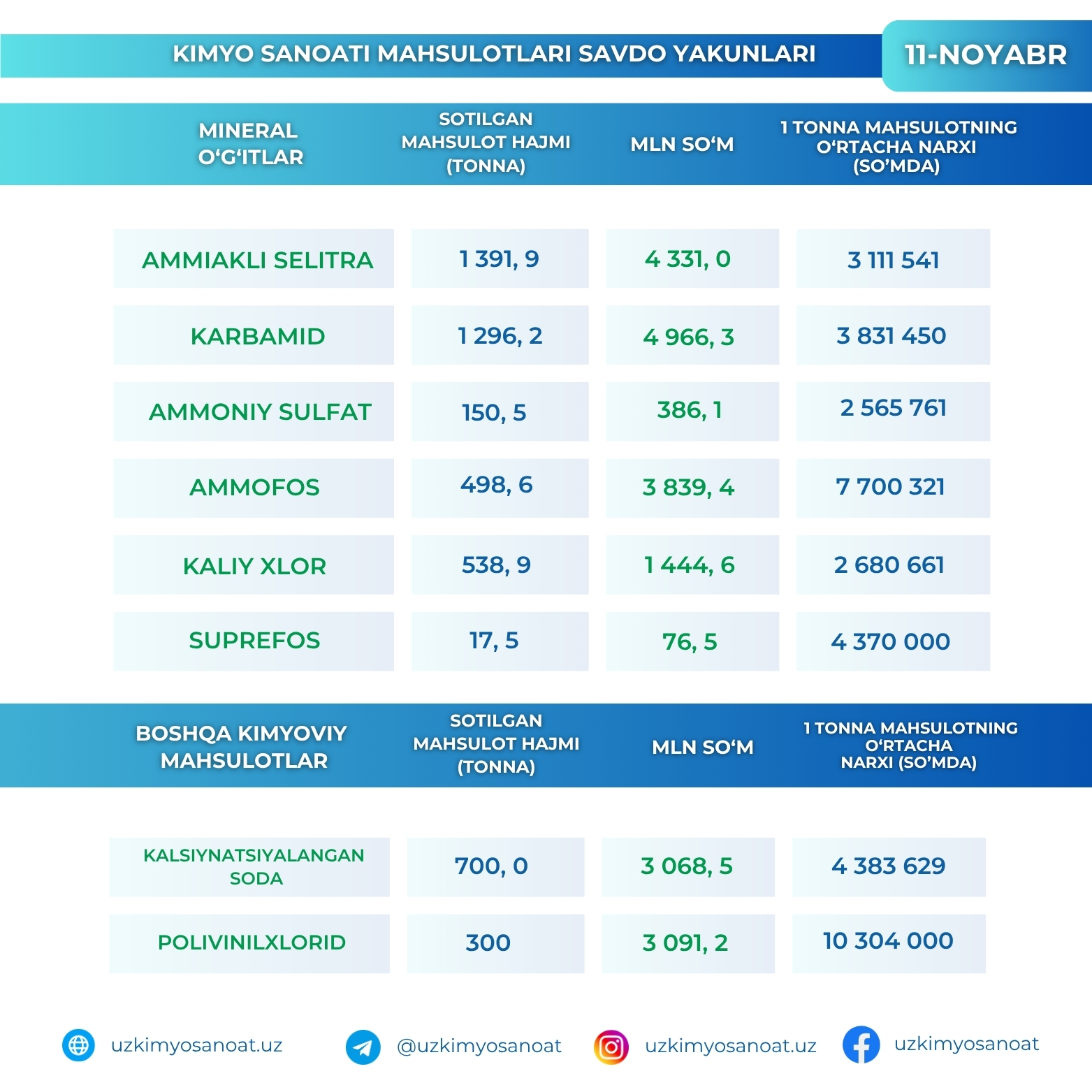 O‘zbekiston Respublika tovar-xom ashyo birjasidagi kimyo sanoati mahsulotlarining 11-noyabr kunidagi savdo yakunlari