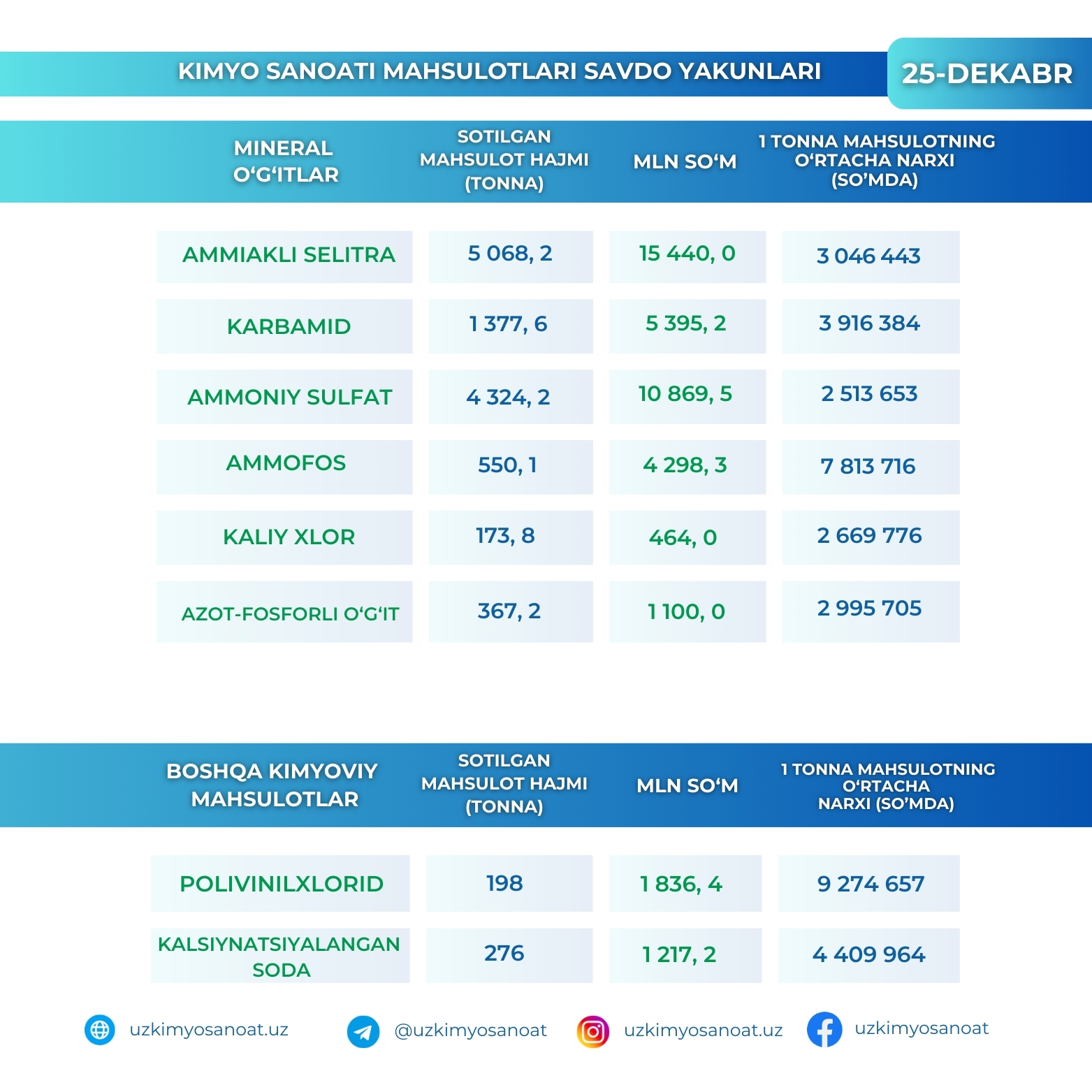 O‘zbekiston Respublika tovar-xom ashyo birjasidagi kimyo sanoati mahsulotlarining 25-dekabr kunidagi savdo yakunlari