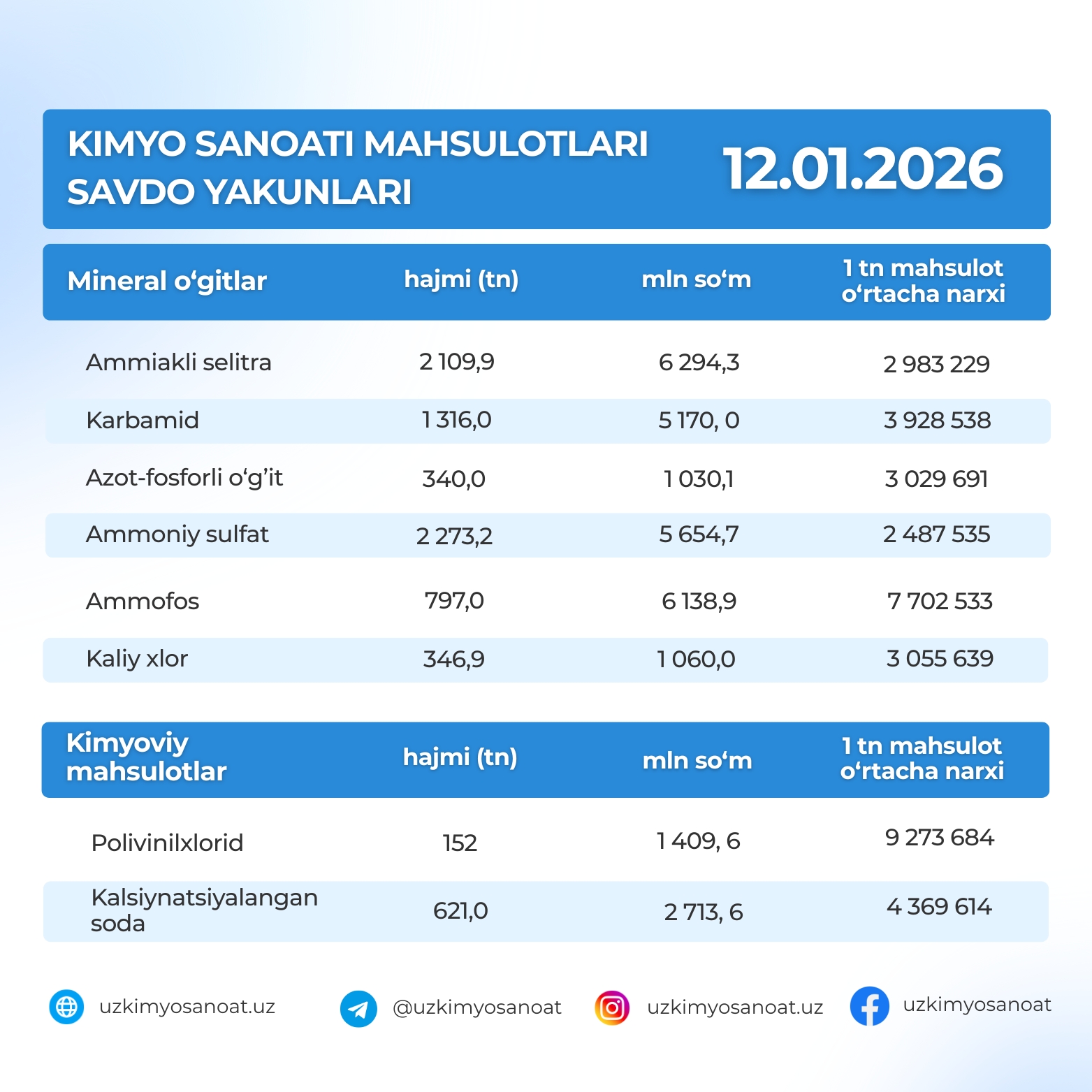 O‘zbekiston Respublika tovar-xom ashyo birjasidagi kimyo sanoati mahsulotlarining 2026-yil 12-yanvar kunidagi savdo yakunlari