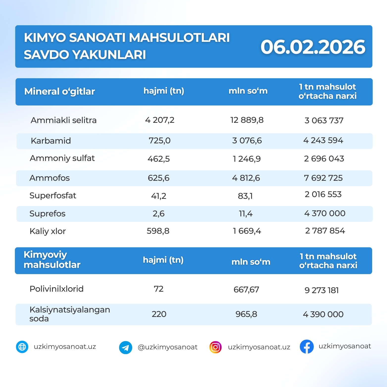 O‘zbekiston Respublika tovar-xom ashyo birjasidagi kimyo sanoati mahsulotlarining savdo yakunlari: 06.02.2026