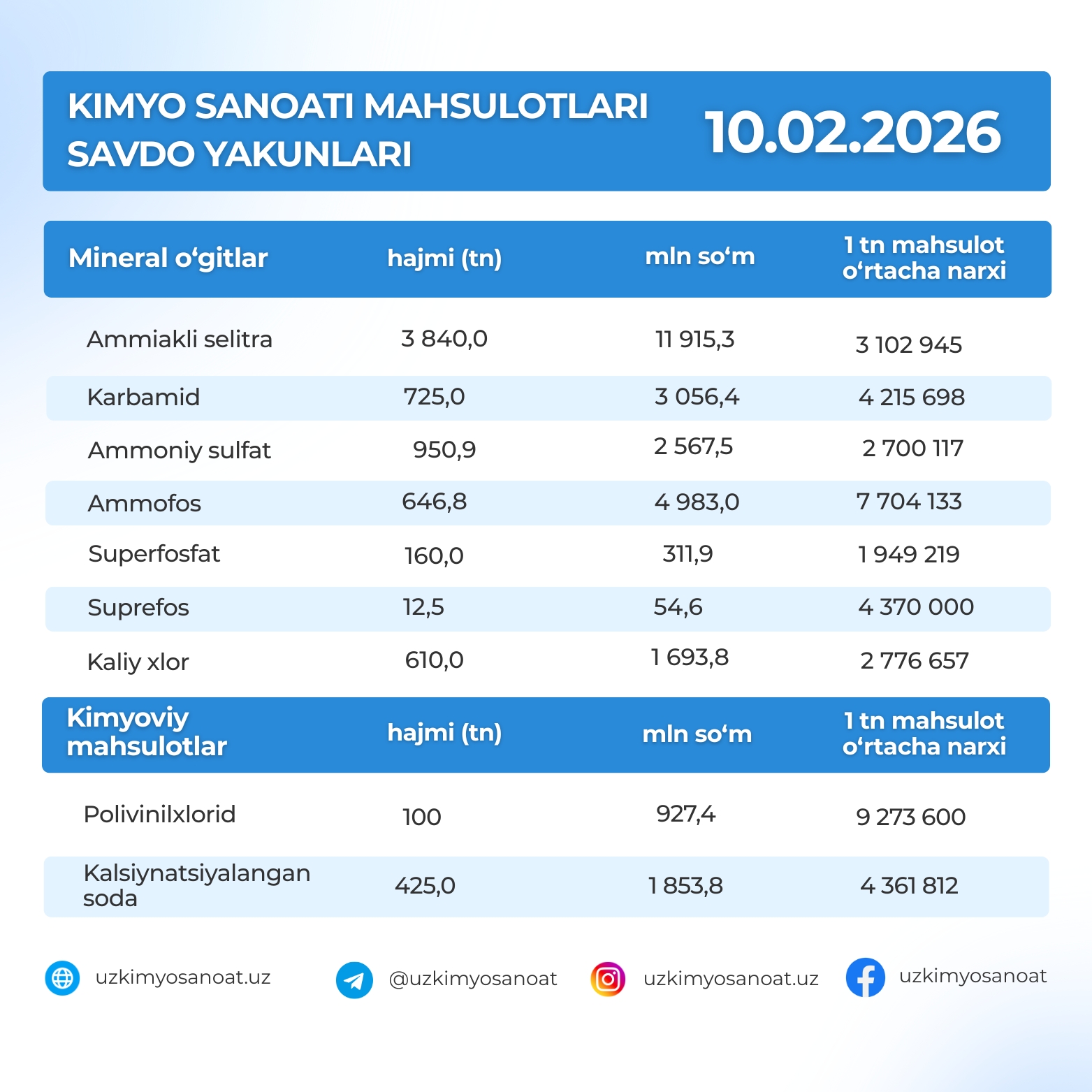 O‘zbekiston Respublika tovar-xom ashyo birjasidagi kimyo sanoati mahsulotlarining savdo yakunlari: 10.02.2026