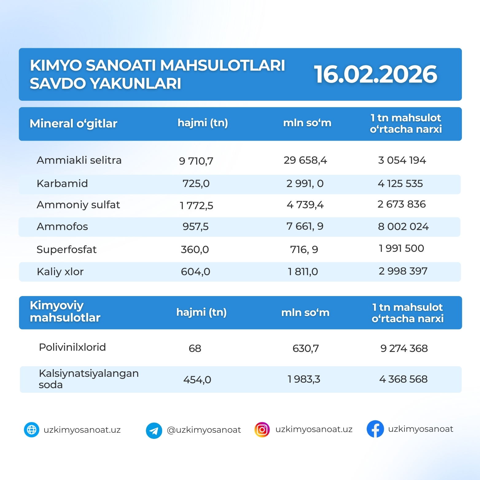 O‘zbekiston Respublika tovar-xom ashyo birjasidagi kimyo sanoati mahsulotlarining savdo yakunlari : 16.02.2026