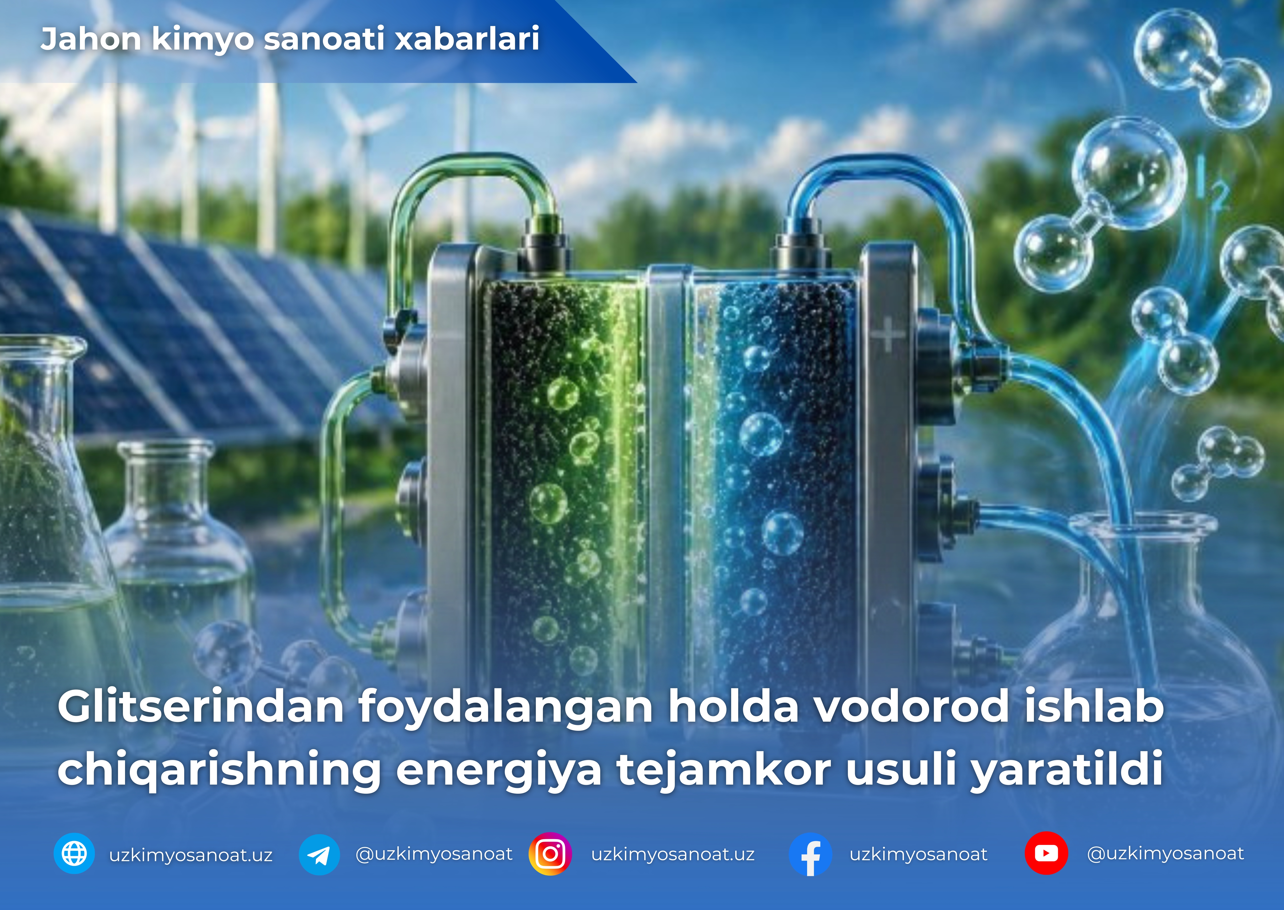 Janubiy Koreya tadqiqotchilari yangi avlod yuqori samaradorlikka ega elektrokimyoviy tizimni taqdim etishdi. U bir vaqtning oʻzida vodorod va qimmatli kimyoviy birikmalarni ishlab chiqarishga qodir boʻlib, xomashyo sifatida glitserin chiqindilaridan foydalanadi. Ushbu ishlanma “yashil” vodorod ishlab chiqarish xarajatlarini kamaytirish va shu bilan birga sanoatda talab yuqori boʻlgan kimyoviy mahsulotlarni parallel sintez qilish orqali iqtisodiy samaradorlikni oshirishga qaratilgan.