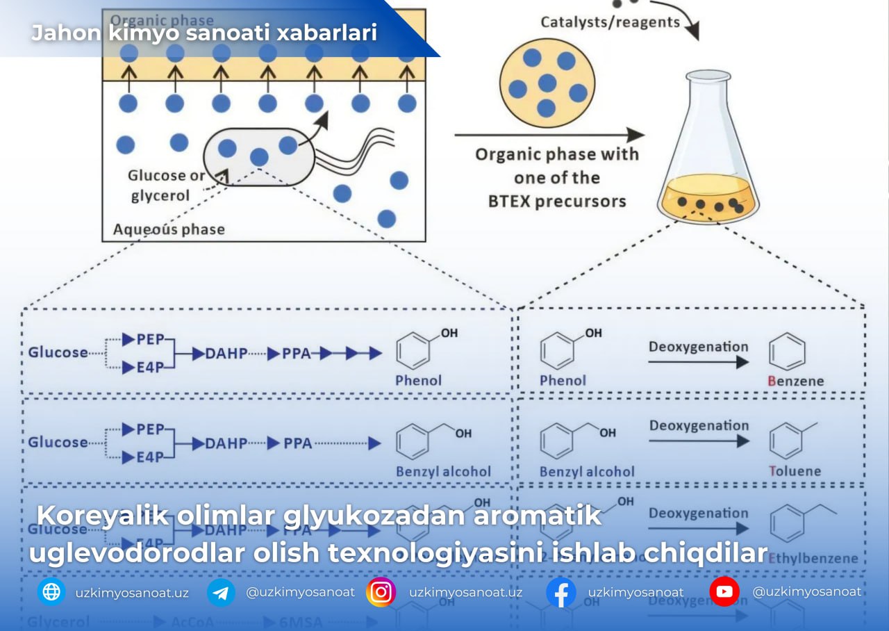 Koreya Ilg‘or Fan va Texnologiya Instituti (KAIST) tadqiqotchilari glyukoza va glitserin kabi qayta tiklanuvchi uglerod manbalaridan muhim aromatik uglevodorodlar — benzol, toluol, etilbenzol va para-ksilol (BTEX) — olish imkonini beradigan integrallashgan bioximiyaviy jarayonni yaratdilar. PNAS (Proceedings of the National Academy of Sciences) jurnalida chop etilgan maqolaga ko‘ra, ushbu ishlanma neft-kimyo tarmog‘ini qazib olinadigan xom-ashyolarga bo‘lgan qaramligini kamaytirish asosiga aylanishi mumkin.