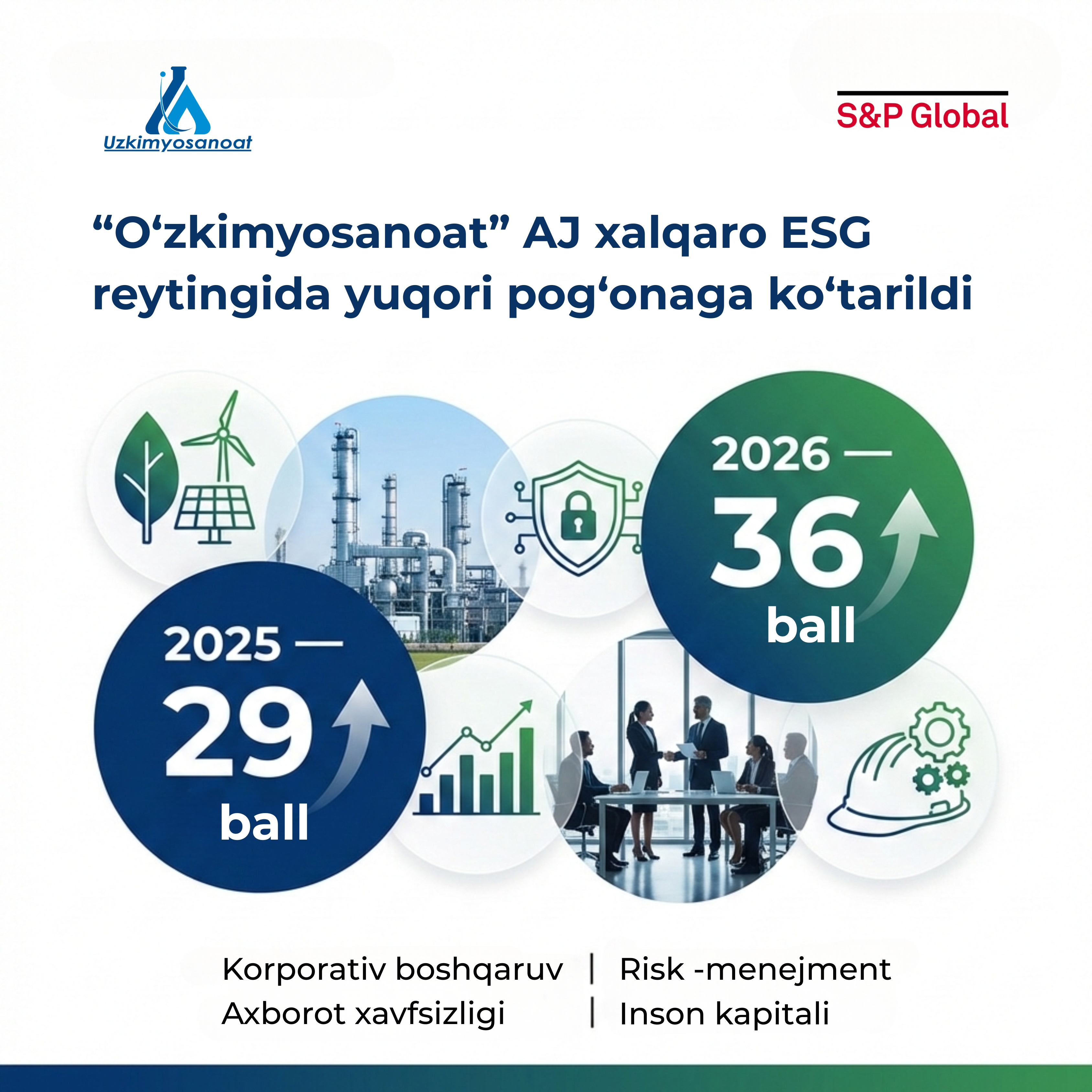 Barqaror rivojlanish, ekologik mas’uliyat va samarali korporativ boshqaruv yo‘nalishlarida amalga oshirilgan tizimli chora-tadbirlar natijasida joriy yilda “O‘zkimyosanoat“ AJning ESG ko‘rsatkichi 36 ballga yetdi.