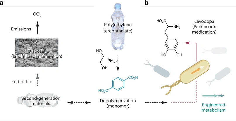 Jarayon davomida PET tereftal kislotasiga parchalanadi. Soʻngra ushbu modda genetik jihatdan oʻzgartirilgan ichak tayoqchasi bakteriyalari (E. coli) uchun oziqlantiruvchi muhit sifatida ishlatiladi. Mikroorganizmlar ichida uglerod bir qator biokimyoviy reaksiyalar orqali oʻtib, natijada levodopa hosil boʻladi. Tibbiyotda u Parkinson kasalligiga chalingan bemorlarda dofamin yetishmovchiligini qoplaydi.