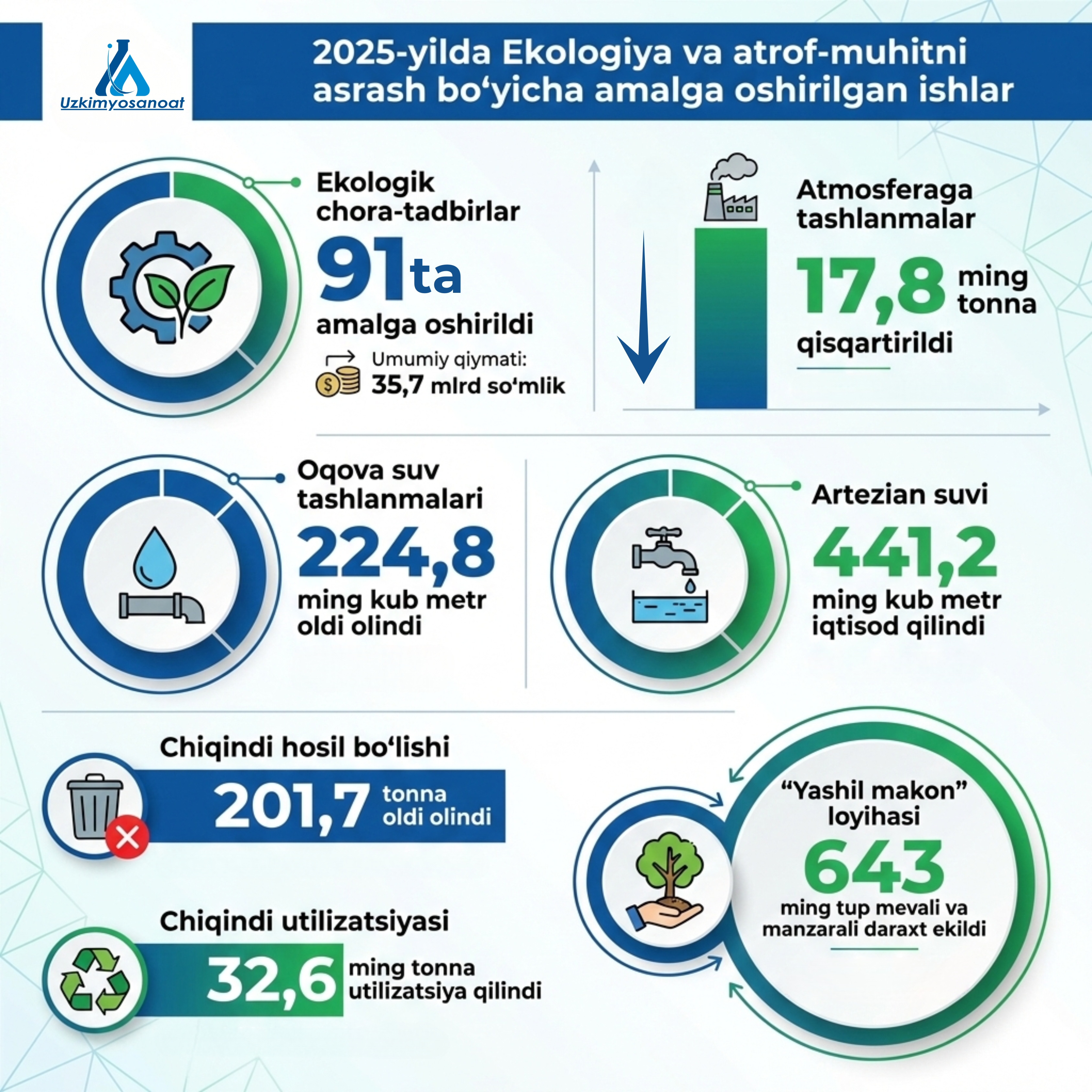 “Oʻzkimyosanoat” AJ tarmoq korxonalarida 2025-yil davomida ekologiya va atrof-muhitni muhofaza qilish, tabiiy resurslardan oqilona foydalanish hamda ekologik xavfsizlikni taʼminlashga qaratilgan keng koʻlamli ishlar amalga oshirildi.