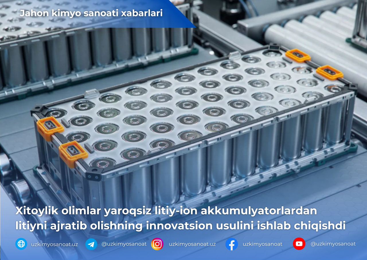 Xitoylik olimlar yaroqsiz litiy-ion akkumulyatorlardan litiyni ajratib olishning innovatsion usulini ishlab chiqishdi.