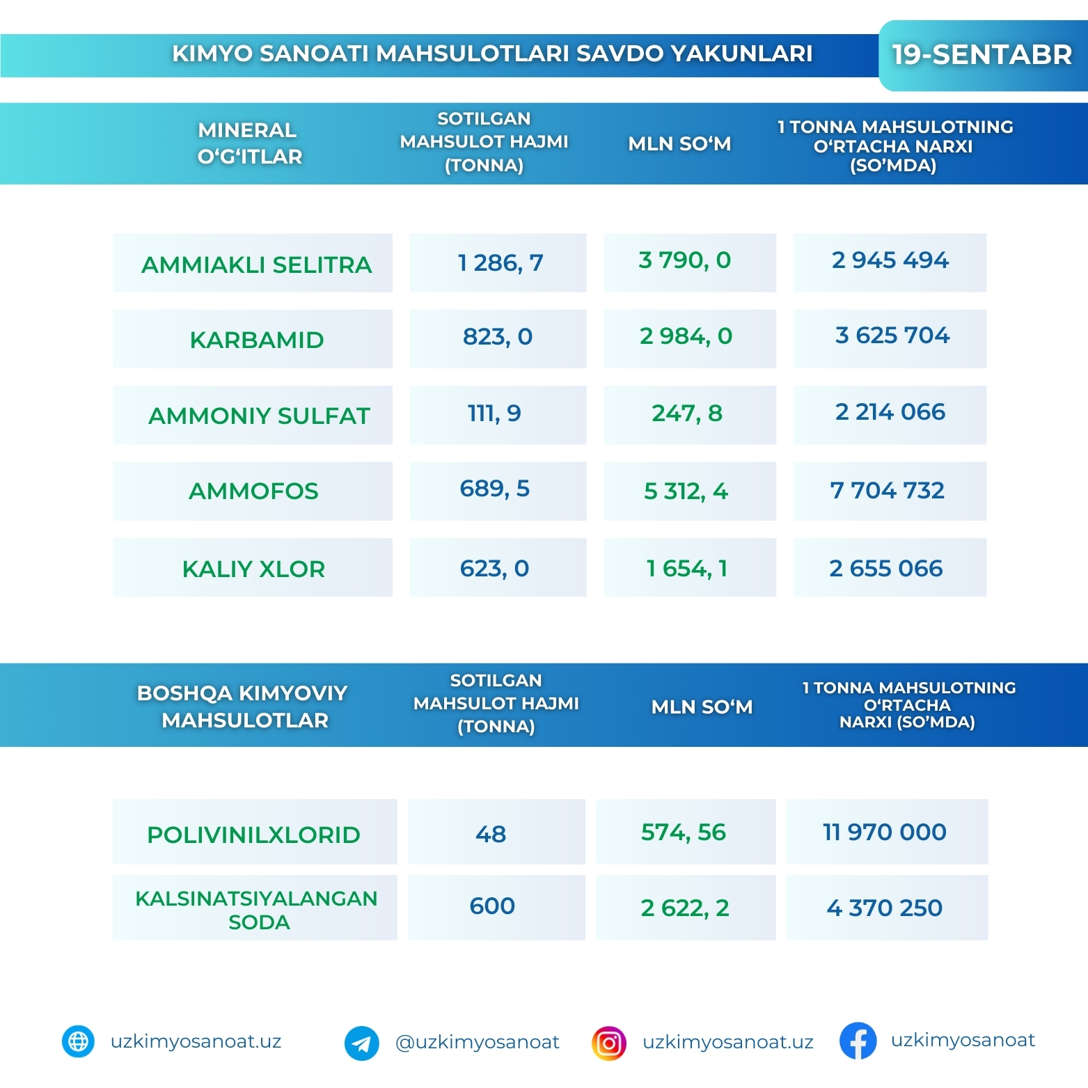 Итоги торгов продукцией химической промышленности на Узбекской республиканской товарно-сырьевой бирже за 19-сентября