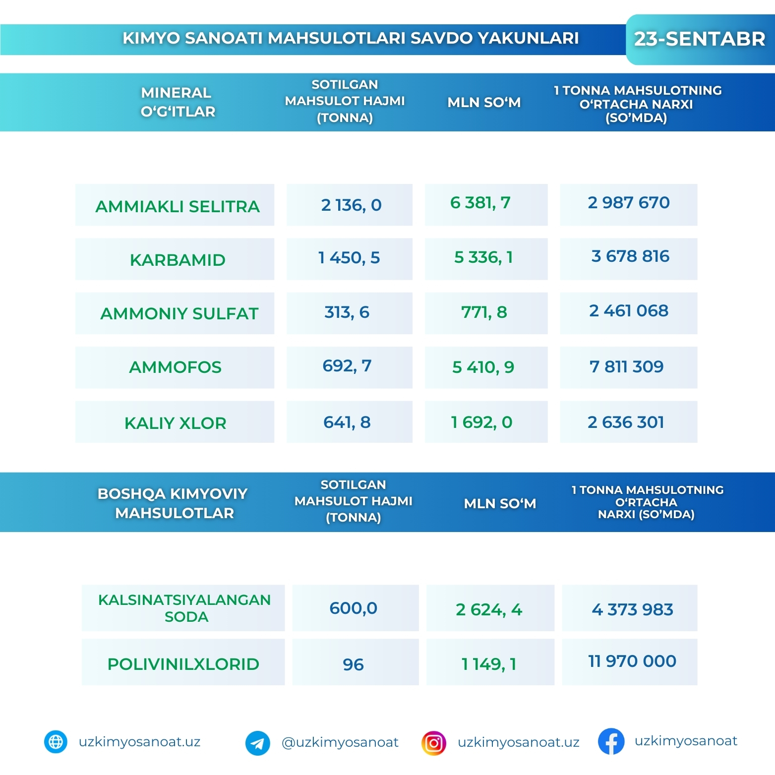 Итоги торгов продукцией химической промышленности на Узбекской республиканской товарно-сырьевой бирже за 23-сентября