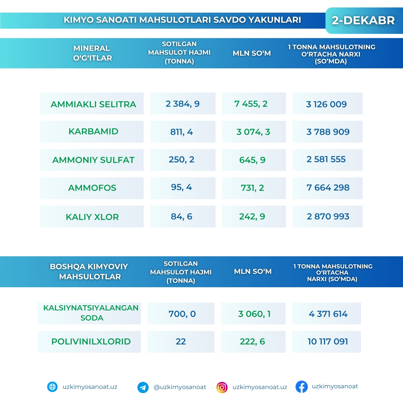Итоги торгов продукцией химической промышленности на Узбекской республиканской товарно-сырьевой бирже за 2-декабря