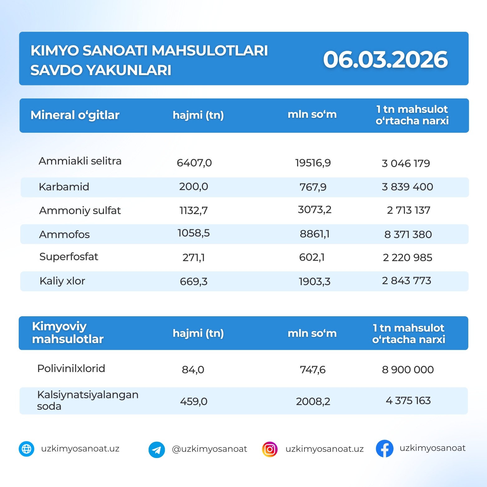 Ўзбекистон Республика товар-хом ашё биржасидаги кимё саноати маҳсулотларининг савдо якунлари: 06.03.2026