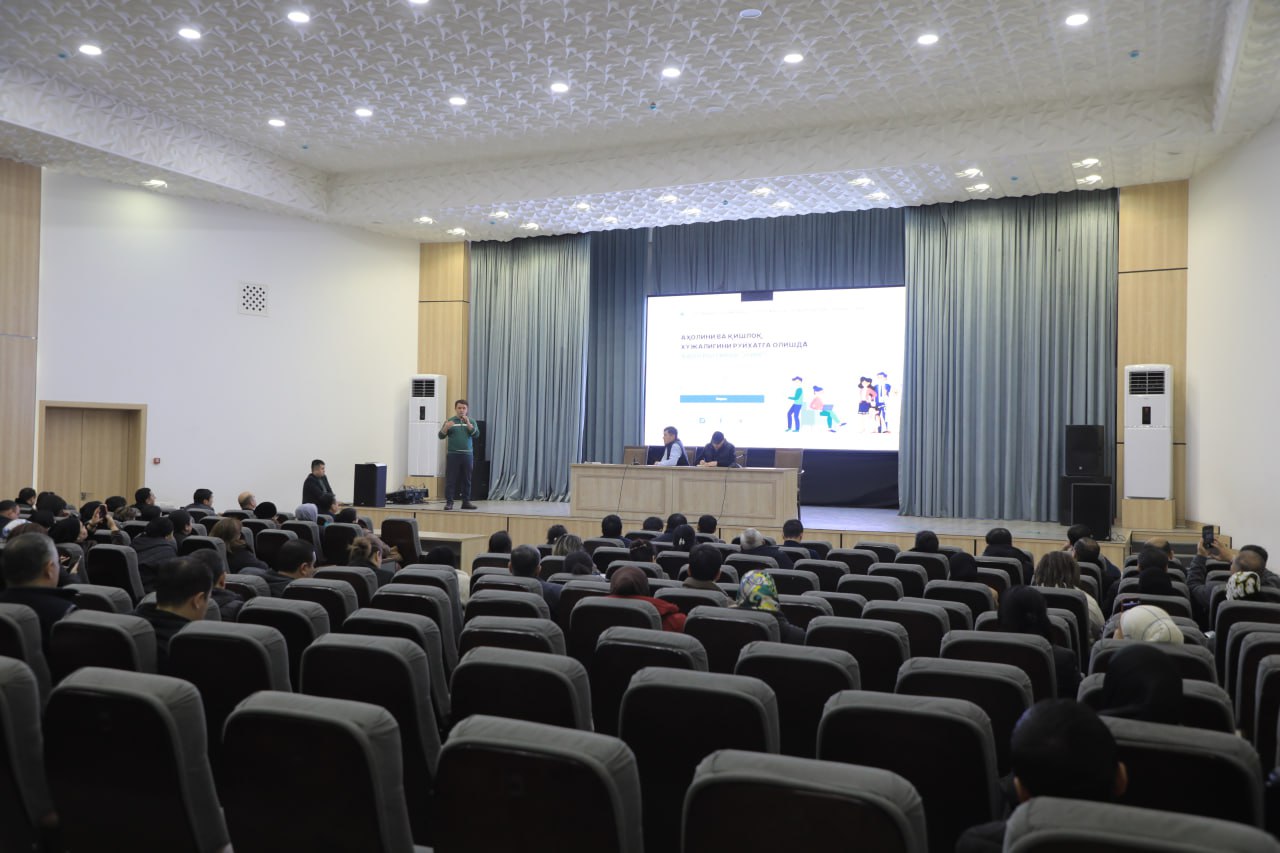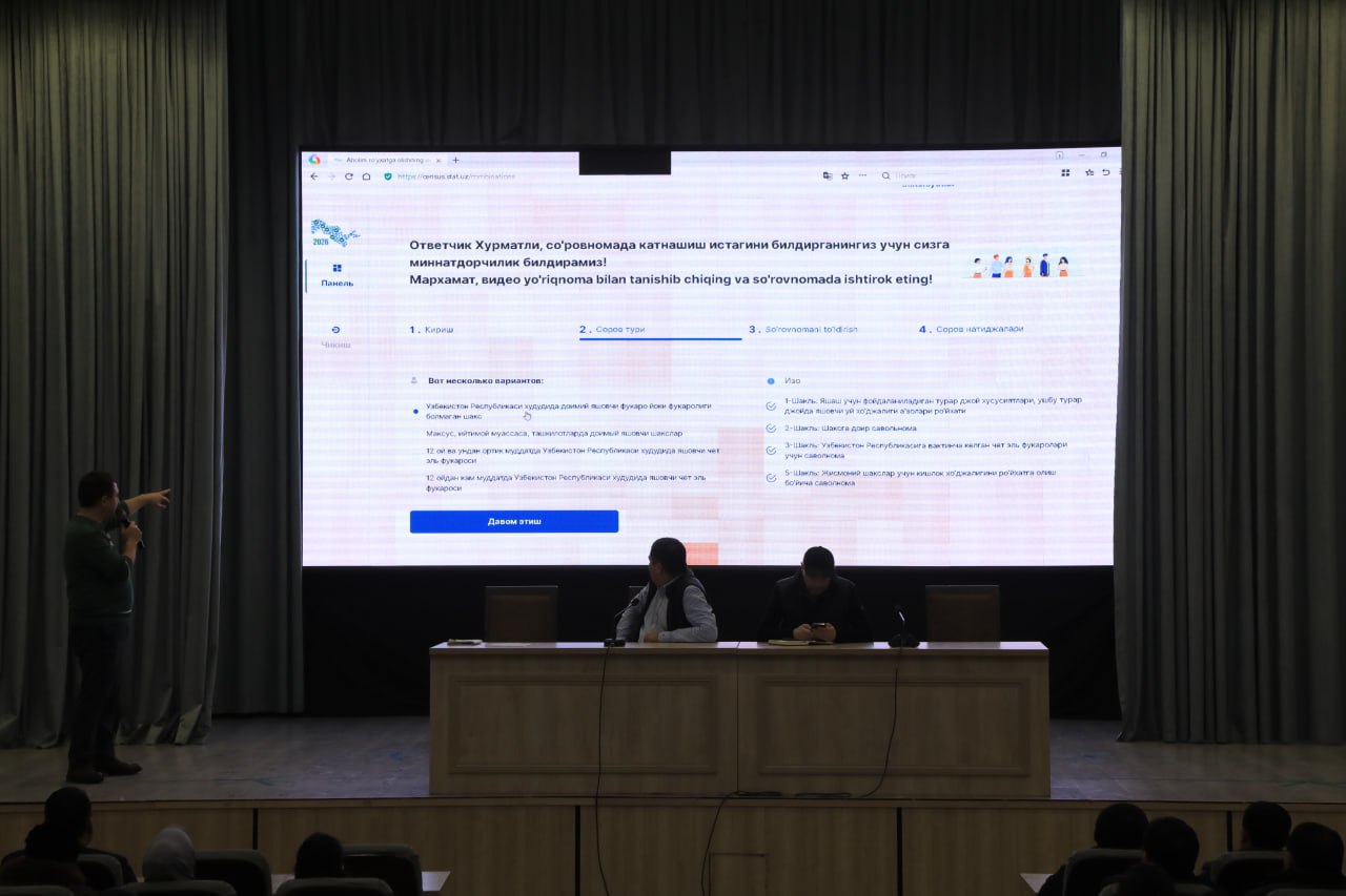 Машғулот давомида иштирокчиларга аҳолини рўйхатга олиш тадбирининг ҳуқуқий асослари, ташкилий механизмлари, маълумотларни йиғиш тартиби, аҳолининг хабардорлигини ошириш ва жараённи сифатли амалга ошириш бўйича муҳим йўналишлар атрофлича тушунтирилди.