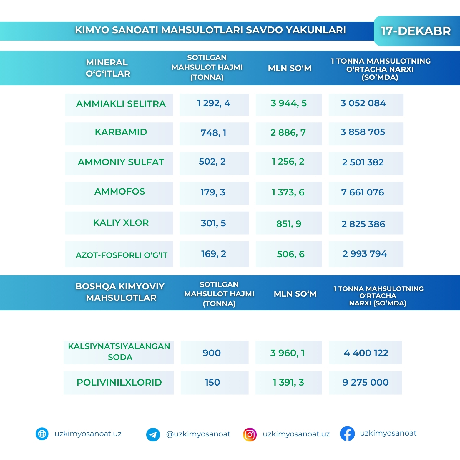 Ўзбекистон Республика товар-хом ашё биржасидаги кимё саноати маҳсулотларининг 17-декабр кунидаги савдо якунлари