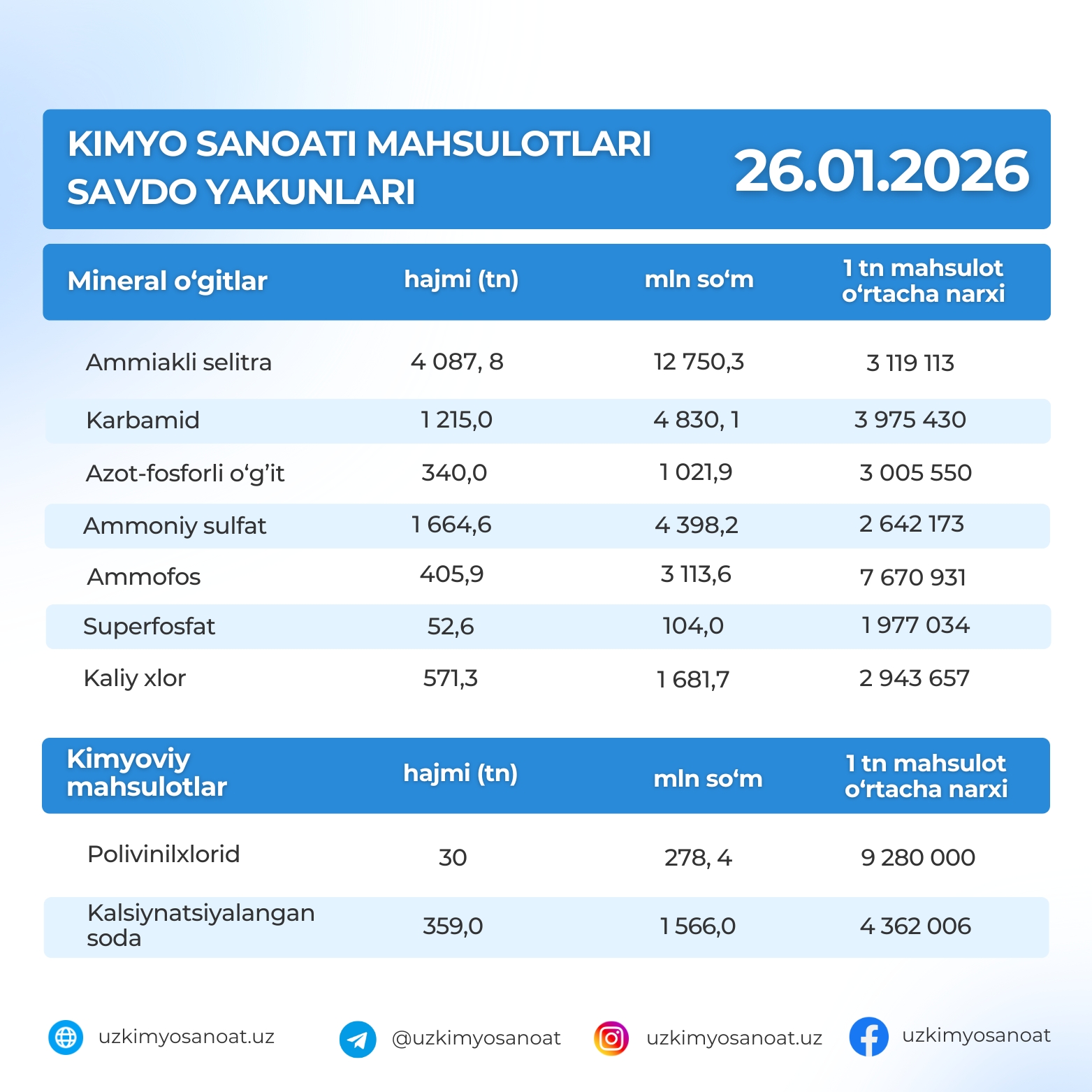 Ўзбекистон Республика товар-хом ашё биржасидаги кимё саноати маҳсулотларининг 26-январ кунидаги савдо якунлари