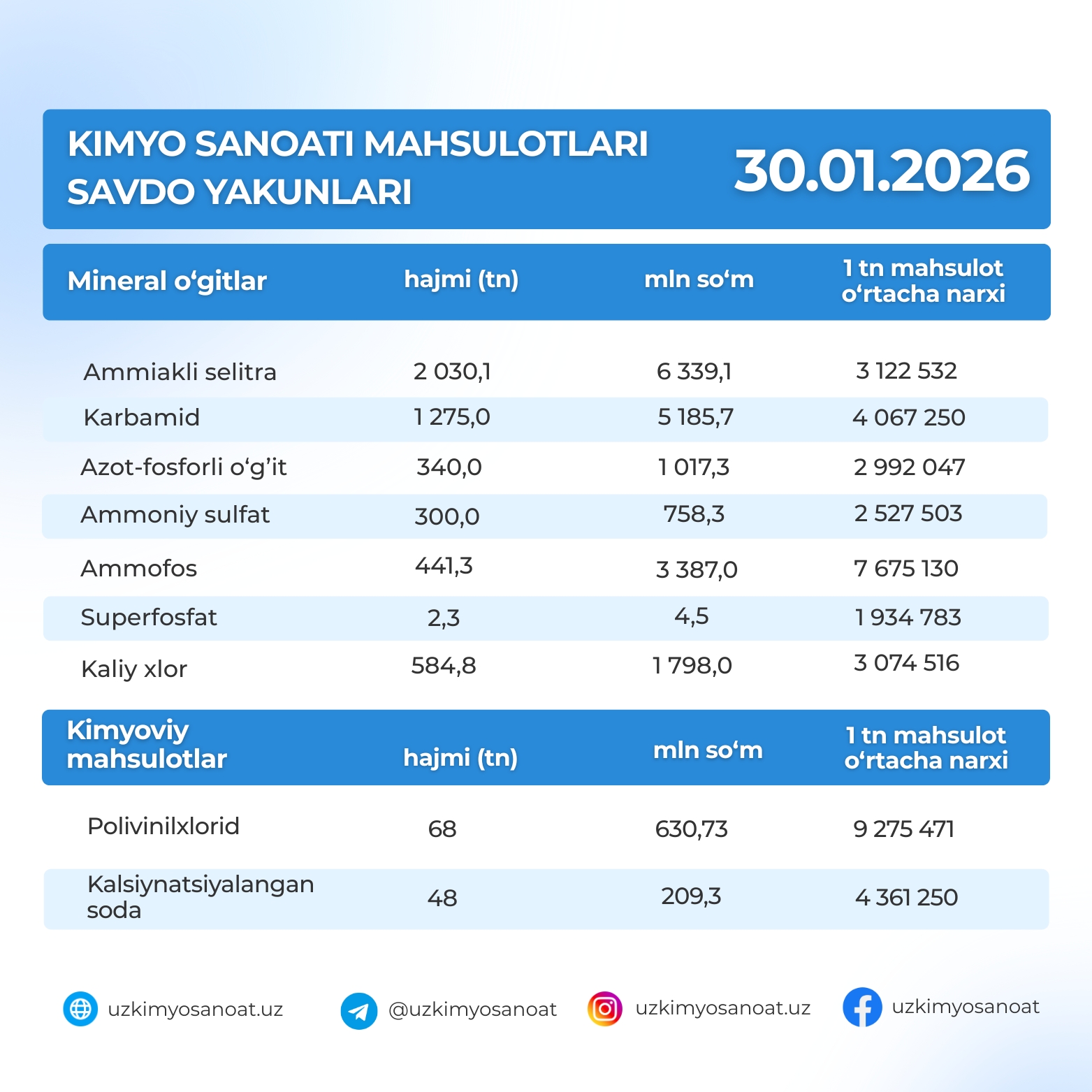 Ўзбекистон Республика товар-хом ашё биржасидаги кимё саноати маҳсулотларининг 30-январ кунидаги савдо якунлари